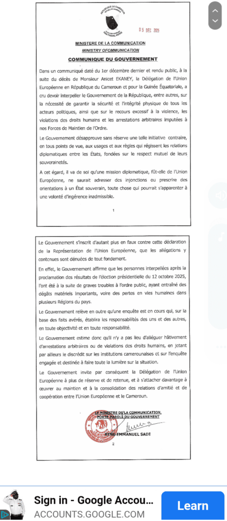 « …Une mission diplomatique, fût-elle celle de l’Union européenne, ne saurait adresser des injonctions, ou prescrire des orientations à un État souverain ; toute chose qui pourrait s’apparenter à une volonté d’ingérence inadmissible« . La dénonciation est de René Emmanuel Sadi, ministre de la Communication. Dans un communiqué signe ce 5 décembre 2025, le porte-parole du gouvernement réagit à la sortie de la délégation de l’Union européenne en lien avec la crise post-électorale qui a vu des dizaines de morts et des centaines d’arrestations sur l’ensemble du territoire national. Mais plus précisément sur la mort d’Anicet Ekane survenue au petit matin du 1er décembre 2025. L’UE appelait le gouvernement camerounais « à garantir la sécurité et l’intégrité physique de tous les acteurs politiques, ainsi que sur le recours excessif à la violence, aux violations des droits humains« , rappelle le communiqué.
