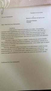 Dans une autre lettre adressée cette fois-ci au peuple camerounais. « Nous avons pris des décisions qui ont peut-être suscité des doutes quant à notre engagement envers la patrie », commencent-ils leur lettre. Rappelant le geste fait par les pouvoirs publics, « l’ensemble des joueurs a préféré décliner l’offre parce qu’elle ne correspond pas à l’esprit des problèmes que nous avons posés », écrivent les joueurs. Alors, à l’intention du gouvernement, « nous irons représenter la nation camerounaise et nous allons donner le meilleur de nous-mêmes, pour défendre le titre avec dignité et fierté », assure-t-ils. Cependant, « nous souhaitons pour le futur, plus de professionnalisme, plus de communication dans l’organisation du football au Cameroun», et « plus de respect » à l’endroit des acteurs du mouvement sportif, concluent-ils. Non sans avoir rappelé au peuple camerounais que « de génération en génération, nous faisons l’objet des mêmes problèmes (Sic)». En insistant sur le fait que « beaucoup de choses doivent changer, et c’est la raison pour laquelle nous avons pris une position forte ces derniers jours ». Une lettre signée de tous les joueurs.