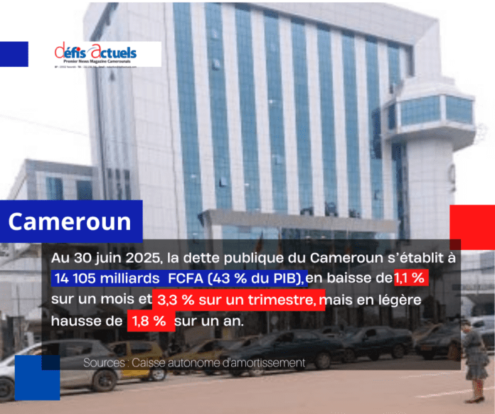 Yaoundé, 1er août (Défis Actuels) — Au 30 juin 2025, l’encours de la dette publique du Cameroun s’élève à 14 105 milliards de FCFA. Selon les données de Caisse autonome d’amortissement publiées le 31 juillet 2025, le pays maintient un niveau soutenable à 43 % du PIB. Cette dette enregistre une baisse de 1,1 % par rapport au mois précédent, et de 3,3 % sur le trimestre. En glissement annuel, elle affiche néanmoins une légère hausse de 1,8 %.