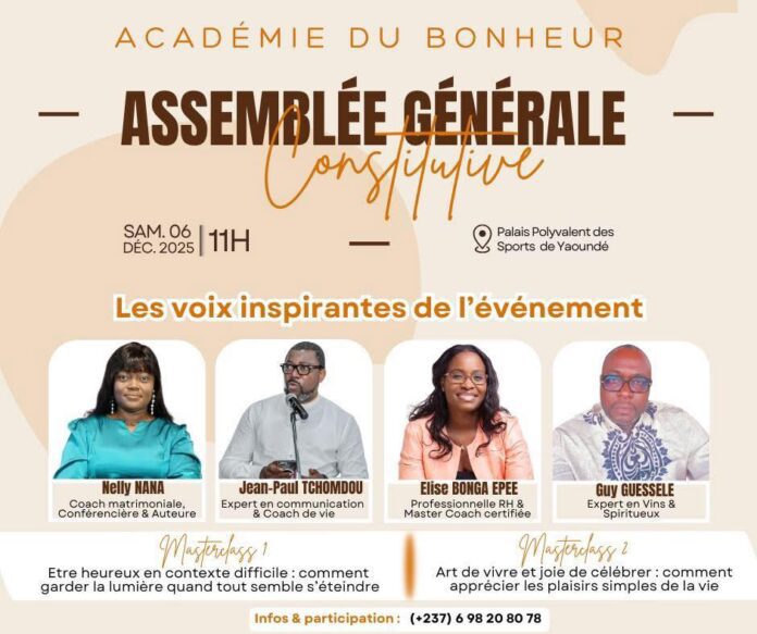 L’Académie du Bonheur du Cameroun passe à l’étape institutionnelle. Le 6 décembre 2025, le mouvement organise sa première Assemblée générale constitutive. L’objectif affiché est simple : « Fonder officiellement l’Académie du Bonheur et définir sa stratégie pour 2026 ». Le programme s’étale l’après-midi, de l’accueil des participants à la signature de la Charte du Bonheur. Chaque séquence vise à donner un cadre clair à une initiative née en ligne et devenue, en quelques mois, un espace de solidarité.
