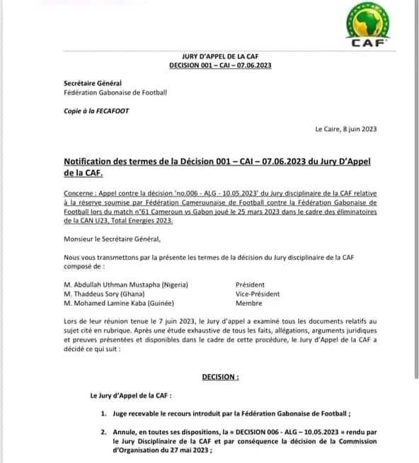 « Le jury disciplinaire de la Caf juge recevable le recours déposé par la Fédération gabonaise de football, annule en toutes ses dispositions la décision OO6 –ALG- 10.05.2023 rendue par le jury disciplinaire de la CAF et par conséquence la décision de la Commission d’organisation du 27 mai 2023 ;…rejette les autres demandes». Ça y est ! Les Lions indomptables ne joueront plus la Coupe d’Afrique des nations (CAN) Espoirs Maroc 2023. Ainsi en a décidé le Jury disciplinaire de la Confédération africaine de football (CAF) réuni ce 7 juin 2023 et qui a notifié les parties ce jour.