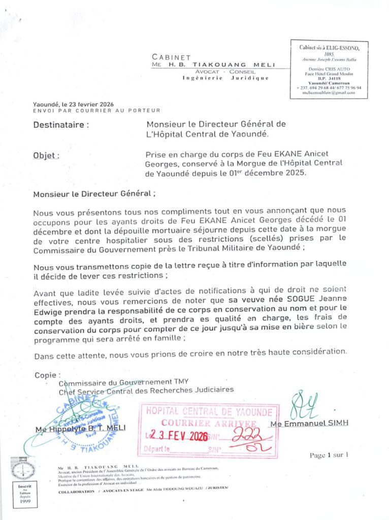 Par un courrier daté de ce 23 février 2026, Me Meli Hyppolite, conseil d’Anicet Ekanè saisit l’hôpital central de Yaoundé aux fins de l’informer qu’à compter de « ce jour », Jeanne Sogue la veuve du défunt prend en charge désormais la responsabilité sur cette dépouille. Le conseil informait par le fait l’établissement hospitalier que le commissaire du gouvernement a levé les scellés sur cette dépouille qui y séjourne depuis le 1er décembre 2025, date de son décès. Après exactement 85 jours de scellés.