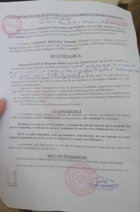 Par exploit d’huissier, Samuel Eto’o constate que Benjamin Didier Banlock qui a annoncé sa démission ce 18 mai 2022, détient encore les clés du bureau qu’il occupait, ainsi que le véhicule de fonction. Le président de la Fécafoot n’a pas encore réagi à cette lettre de démission, réclame les biens. Par le truchement de Me Tchimdou Mekiage Micheline, huissier de justice auprès de la Cour d’appel du Centre, le patron de la Fécafoot invite l’ancien secrétaire général à remettre non seulement les clés et le véhicule affecté à sa fonction, mais aussi à assister à « l’inventaire contradictoire » du contenu de ce qui était son bureau jusqu’à ce jour. A l’occasion, devrait avoir lieu la passation de service avec son successeur dont le nom n’est pas encore connu.