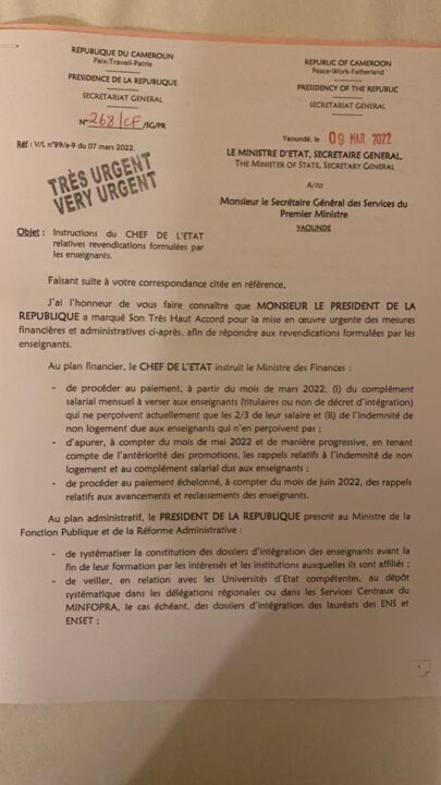 Dans un courrier adressé au Secrétaire général des Services du Premier ministre (SPM), le Secrétaire général de la présidence de la République (SGPR) informe son homologue de l’immeuble Étoile que »le président de la République a marqué son Très haut accord pour la mise en œuvre des mesures administratives et financières ci-après ».