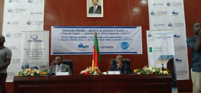 La cérémonie de signature, présidée par Blaise Moussa, directeur général de Camwater et président en exercice de l’AAEA, et Christophe Mien Zok, directeur général du Palais des Congrès de Yaoundé, a scellé, le mercredi 16 juillet 2025, une collaboration pour la mise à disposition des infrastructures du Palais des Congrès pour accueillir l’événement, et la réhabilitation de son système d’alimentation en eau potable. « C’est avec une profonde fierté et un grand sentiment de responsabilité que nous entamons cette phase décisive des préparatifs », a déclaré Blaise Moussa. Selon lui, le partenariat signé permettra de faire du Palais des Congrès une vitrine d’excellence technique, logistique et sanitaire, à la hauteur des ambitions du Cameroun et des standards internationaux.