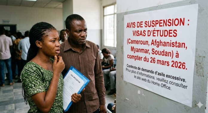 Le gouvernement britannique a annoncé la suspension des visas d’études pour les ressortissants du Cameroun, de l’Afghanistan, du Myanmar et du Soudan, ainsi que l’arrêt de certains visas de travail pour les Afghans. Londres invoque une explosion des demandes d’asile déposées par des titulaires de visas légaux. La mesure, qui entre en vigueur le 26 mars 2026, suscite déjà de vives interrogations à Yaoundé.