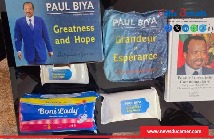 En effet, ces derniers jours, la blogosphère camerounaise s’affole, s’extasie ou se gausse devant les gadgets électoraux du président-candidat Paul Biya. En plus des classiques sacs à dos, pagnes, montres, parapluies et stylos — et sans doute pour édulcorer l’humeur maussade et passablement désespérée des Camerounais accablés par les malheurs et les misères — les conseillers du chef de l’État ont voulu se montrer facétieux en introduisant des objets aussi inattendus qu’insolites : lingettes, lessives, serviettes hygiéniques, tous frappés du fameux slogan de campagne Grandeur et Espérance et d’un beau portrait du candidat.