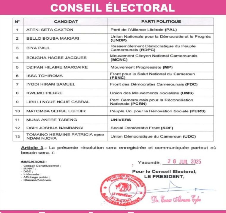 Après examen des dossiers de candidatures à l’élection présidentielle 2025, le Conseil électoral d’Elections Cameroon (Elecam) n’a retenu que 13 candidats sur les 82 enregistrés. Avec »sans surprise » le rejet de la candidature de Maurice Kamto. Confirmant une liste qui avait déjà circulé la veille sur les réseaux sociaux.