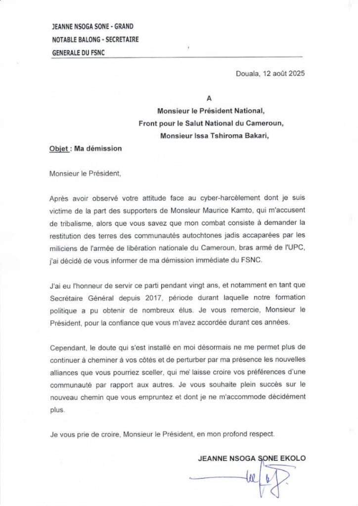 C’est fini entre Jeanne Nsoga et Issa Tchiroma Bakary. La secrétaire générale du Front pour le salut national du Cameroun (Fsnc) vient de démissionner. Abandonnant son candidat en pleine préparation de l’élection présidentielle du 12 octobre 2025. Après avoir servi à ce poste huit années durant.