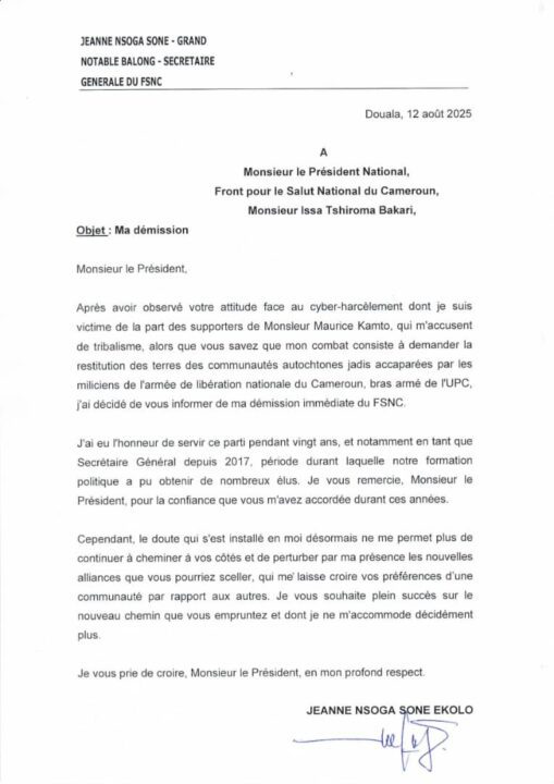 Dès l’entame de sa lettre adressée au président national du Fsnc, Jeanne Nsoga dénonce  »votre attitude » , au sujet du  »cyber harcèlement dont je suis victime de la part des supporters de Maurice Kamto  ». Au sujet de son  »combat » contre l’accaparement des terres des populations du Moungo par la  »branche armée de l’UPC », à savoir l’Armée nationale de libération du Kamerunais (Anlk). Anne Nsoga en a fait une sortie vidéo sur les réseaux sociaux récemment, demandant la rétrocession de ces terres aux populations autochtones. A sa suite, nombre d’internautes dénoncent le  »tribalisme  », l’accusant de stigmatiser les populations Bamileke très nombreux dans la région du Littoral notamment, engagées dans des activités agricoles.