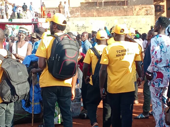 Bientôt, les bruits se font plus retentissants. Le candidat est là. On sautille, on danse, on chante. Au-devant du cortège, des hommes vêtus de T-shirts et casquettes jaunes, estampillés »Mon Bon diable ». On apprend que »ce sont les hommes d’Aristide Mono ». Le jeune universitaire engagé depuis quelques années aux côtés de l’opposition en vue d’une alternance au Cameroun, a rejoint les rangs de celui qui, après l’invalidation de la candidature de Maurice Kamto, lui semble être »le mieux à même de porter les aspirations du peuple du changement ». Le message imprimé sur les T-shirts se rapporte à la sortie de Mgr Barthélémy Yaouda, évêque de Yagoua qui en décembre dernier, avait dans une homélie critique au régime de Yaoundé, indiqué que »même le diable, on prend d’abord, et on verra après ». Évoquant l’élection présidentielle pour laquelle Paul Biya n’avait pas encore annoncé sa candidature, mais dont les signaux montraient déjà que l’homme du Renouveau n’allait pas prendre sa retraite. C’est que l’ancien membre du gouvernement tient désormais un discours aux antipodes des positions qu’il tenait du temps où il était encore aux affaires. Le véhicule de Tchiroma s’ébranle sur la place, au milieu de la foule et se gare près du podium. Cris, youyous montent en intensité.des éléments de police tentent de bloquer le passage à des jeunes forçant le passage vers le podium. Ils n’y parviendront pas. Ces »fous » de Tchiroma sont déterminés à témoigner leur sympathie à leur idole, de plus près.